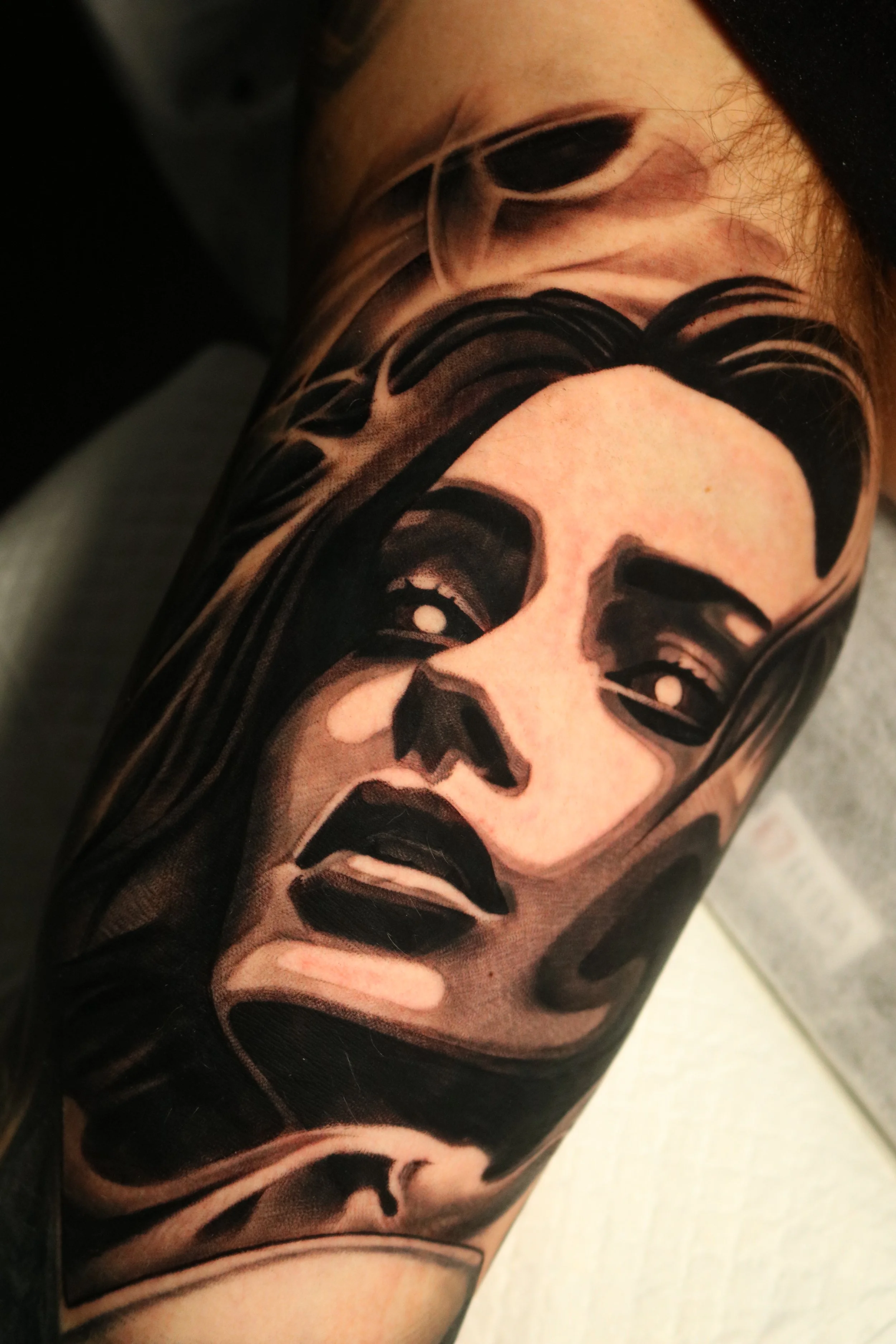 Illustrative tattooer Ricky Brookfield blurs the lines between abstract black work and realism with his striking use of heavy contrast in figures and portraits. His approach embraces neo-traditional styles, particularly in his naturalistic tattoos, where his heavy line work and impeccable blending skills redefine the boundaries of realism. Ricky's mastery of contrast, achieved through bold line work and deep shadows, is especially evident in his detailed tattoos of Greek Gods and female portraits, where each piece becomes a dynamic interplay of light and dark.