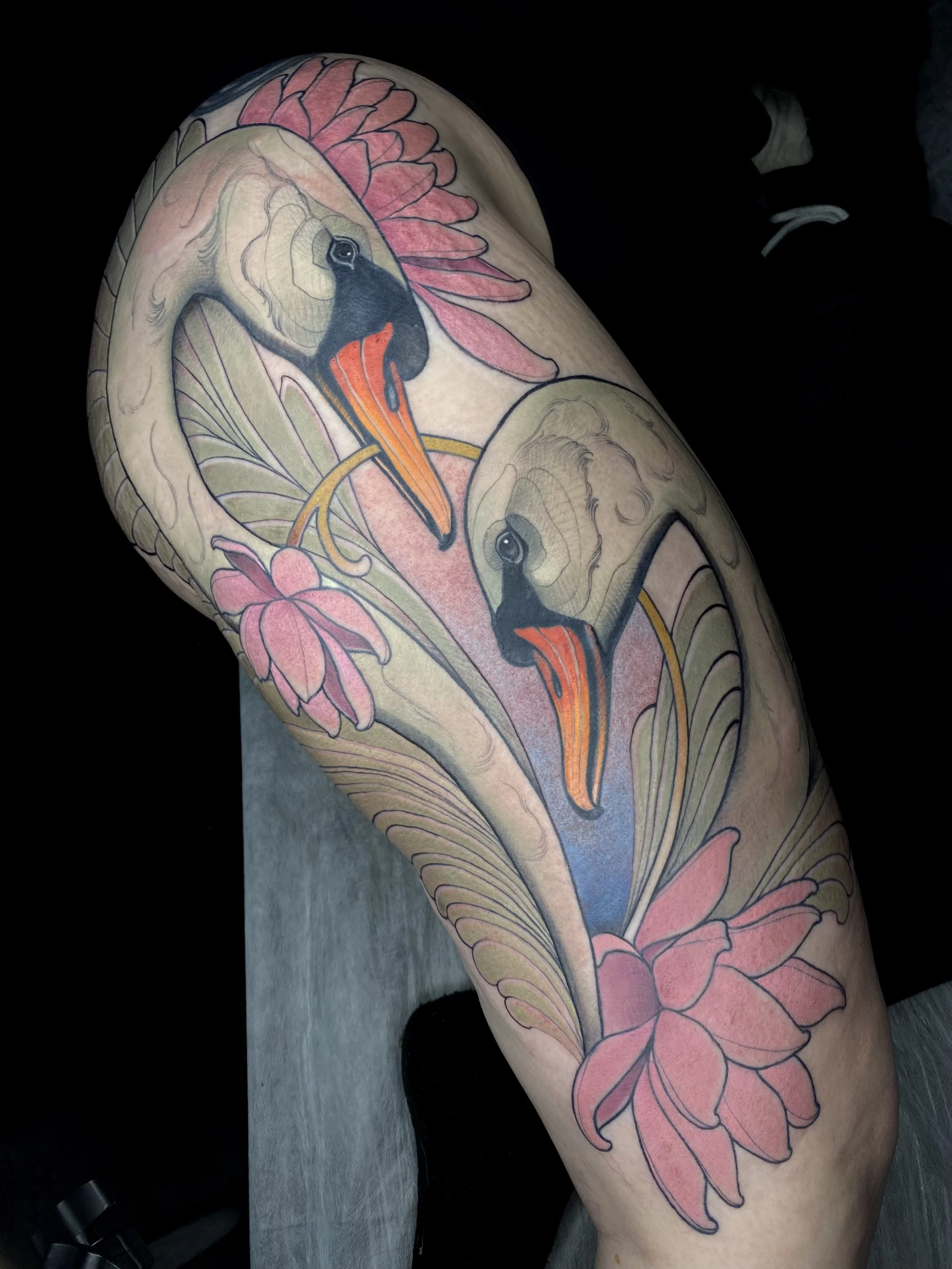 A notable aspect of Tavaria’s artistry is his inclination towards large-scale tattoos. His proficiency shines through in elaborate back pieces and sleeves, where he portrays nature’s most majestic creatures with both grandeur and precision. His designs often feature birds of all species, a subject that forms a significant portion of his portfolio. This passion for avian imagery is evident in the way he captures their grace and beauty, making each piece a testament to his deep connection with and admiration for the natural world.