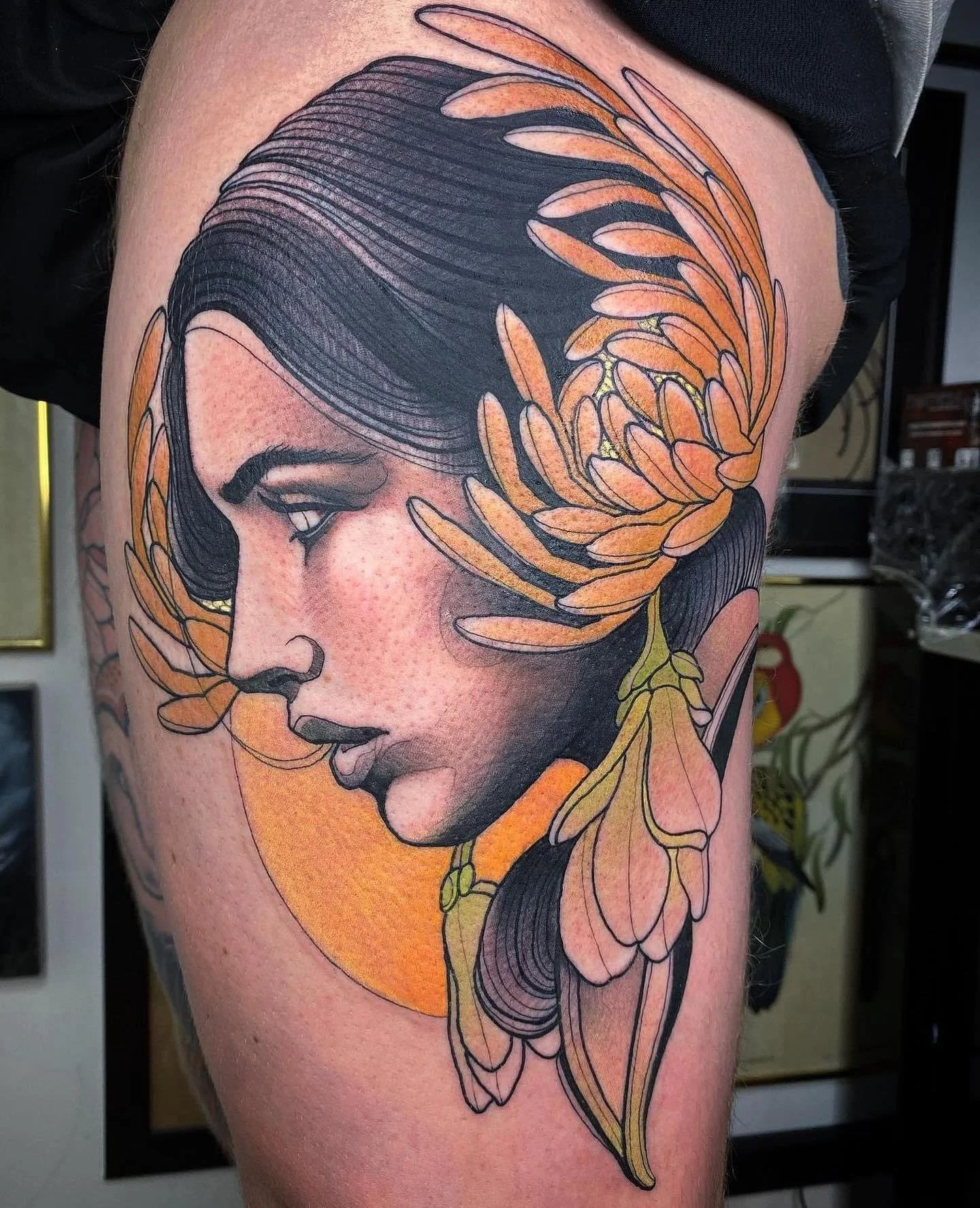 Neo-Traditional tattooing emerged in the late 20th century as a contemporary evolution of the American Traditional style. While it retains the bold lines and vibrant colours characteristic of Traditional tattoos, Neo-Traditional adds a new layer of complexity and artistic freedom. This style is heavily influenced by Art Nouveau and Art Deco, blending the old-school charm with modern aesthetics.